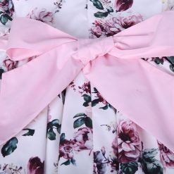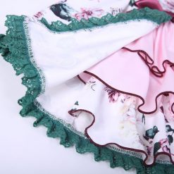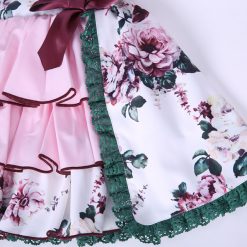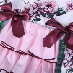 Elegant boutique England style multi colored dress with floral design for baby girls. This is a above knee length (mini) dress with full sleeve. The comes with matching hat and pant. Beautifully decorated with bows and lace.