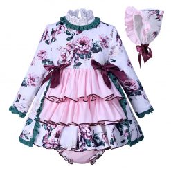 Elegant boutique England style multi colored dress with floral design for baby girls. This is a above knee length (mini) dress with full sleeve. The comes with matching hat and pant. Beautifully decorated with bows and lace.