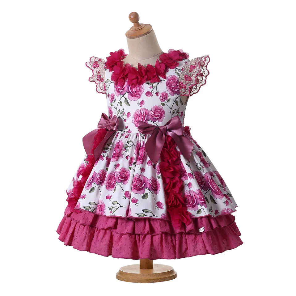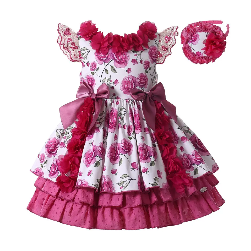 Cute pink floral print dress with two pink bows on the waist. This dress is well-decorated with lace and ruffles on the bottom. It also comes with a matching headband.