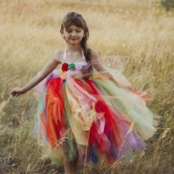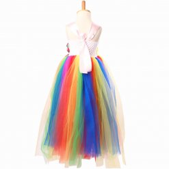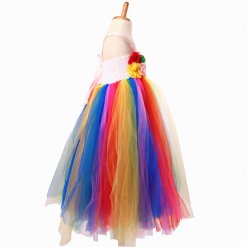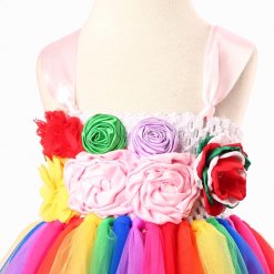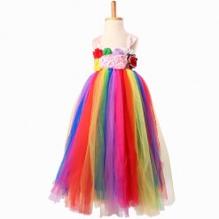 Your little princess looks the part with this gorgeous rainbow ball gown designed with soft strips tulle and colorful flowers.