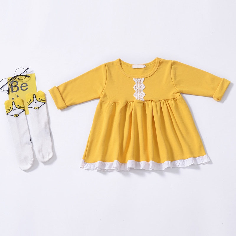 Beautiful Yellow Long Sleeve Toddler Lace Dress for your Little Princess. It is solid color with european and american style.