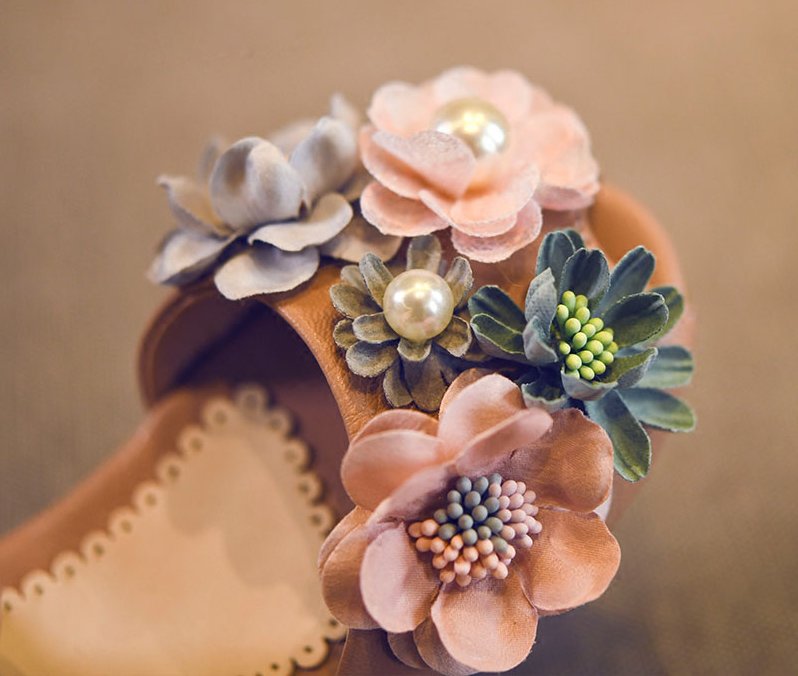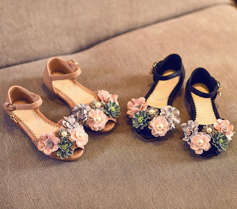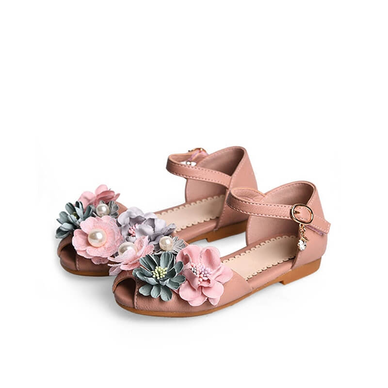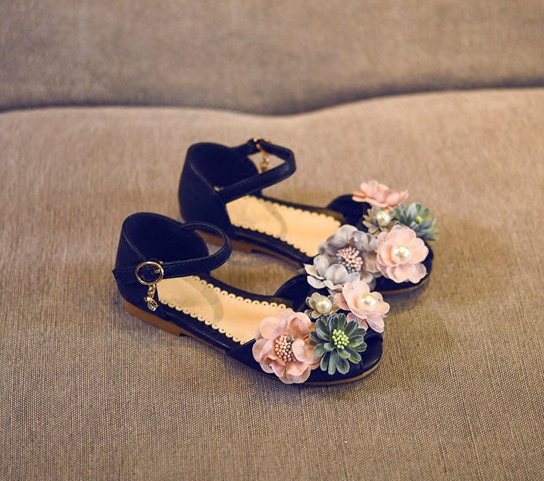 Beautiful flat sandals with colorful flowers on top for your toddler. These are made with soft leather and uses ankle hooks for closure.