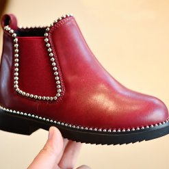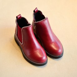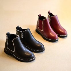 Leather ankle boots for girls with plush fur keeps little feet warm and cozy. These boots are designed with shiny beads on the edges. The sole provides a very firm grip to your little ones.